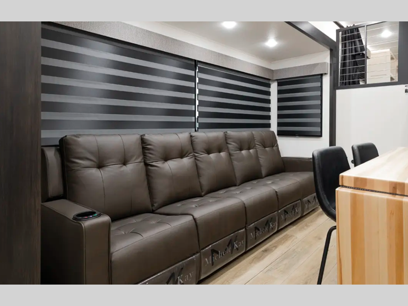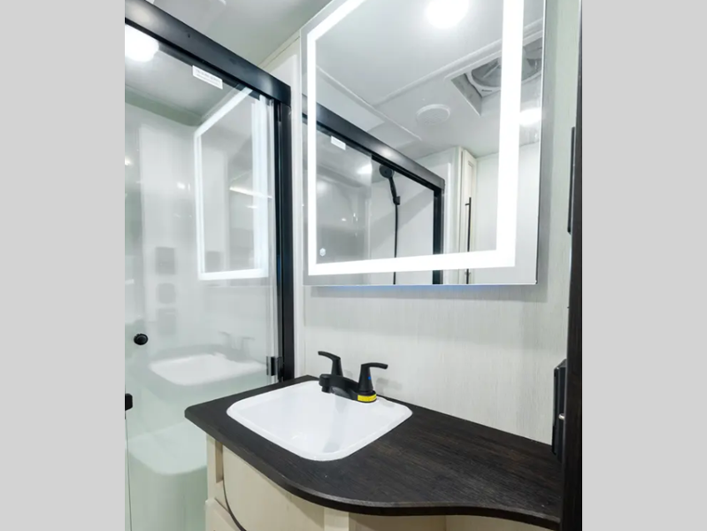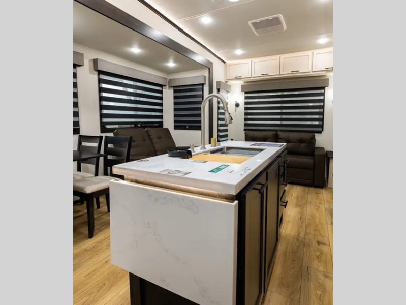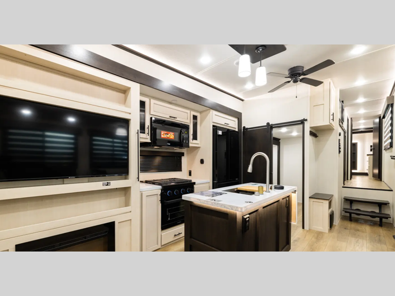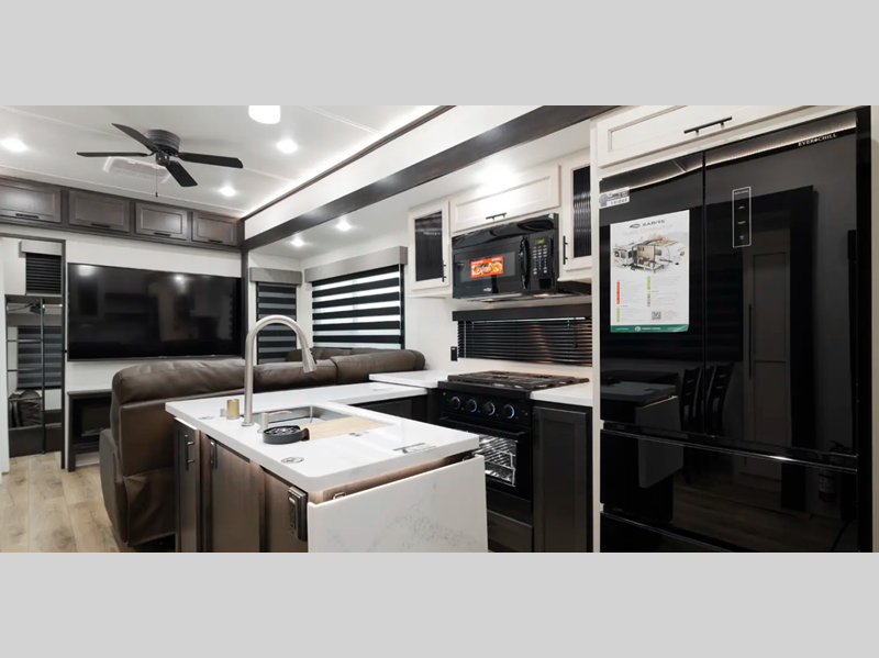 Each model is built durable with vacuum bond laminated sidewalls and a PVC roof membrane, and you'll love the look of the high gloss gel-coat front cap with LED lighting. You can create at-home meals with the fully equipped kitchen that includes Black Opal appliance accents, a spacious refrigerator, plus a workstation farm style sink. There are even more standard features to make you feel right at home, like the tankless water heater, adjustable stable steps, plus ambient accent lighting in the kitchen and living area.