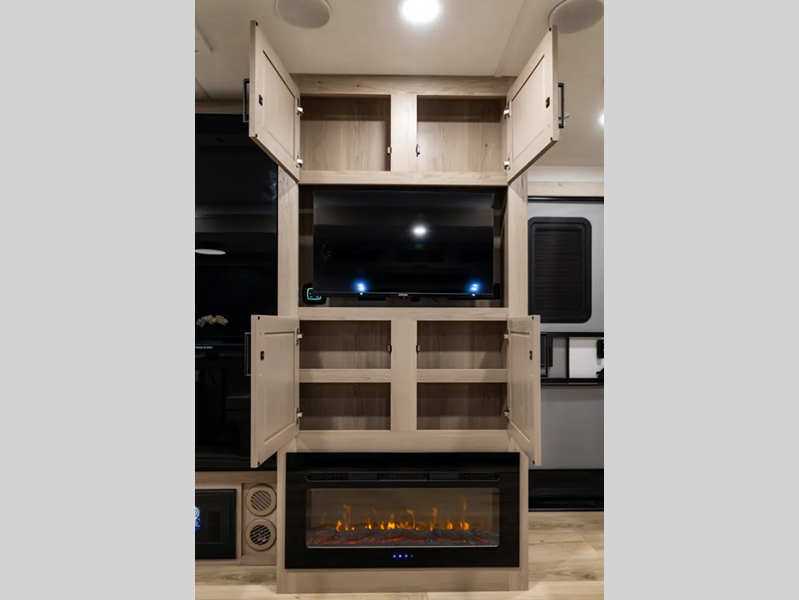 They are each constructed with six-sided aluminum framed walls, floor and roof, and include complete composite wall construction for added durability and insulation. You will also appreciate the enclosed underbelly for added protection! Inside, there is hidden hinge cabinet doors, roller shades, solid surface kitchen countertops, and lino flooring in the slides.