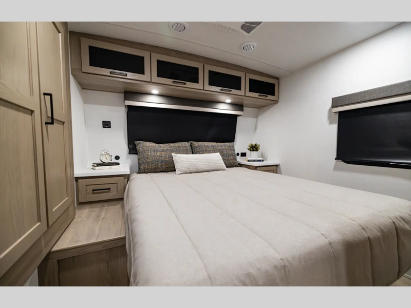 Sleeps 2 Length 29 ft 10 in Ext Width 8 ft 5 in Ext Height 11 ft 3 in Hitch Weight 735 lbs Dry Weight 6069 lbs Cargo Capacity 2315 lbs Fresh Water Capacity 54 gals Grey Water Capacity 90 gals Black Water Capacity 45 gals Furnace BTU 35000 btu Available Beds King Refrigerator Type 12V Cooktop Burners 3 Number of Awnings 1 LP Tank Capacity 20 Lbs. Water Heater Capacity 6 gal Water Heater Type Quick Recovery Auto Ignite Gas/Electric AC BTU 15000 btu TV Info LR Smart TV w/ Lift Awning Info 22' Power Awning w/ Adjustable Rain Dump & LED Lighting Axle Count 2 Number of LP Tanks 2 Shower Type Standard Electrical Service 50 amp Solar Wattage 200 watts Similar Floorplans