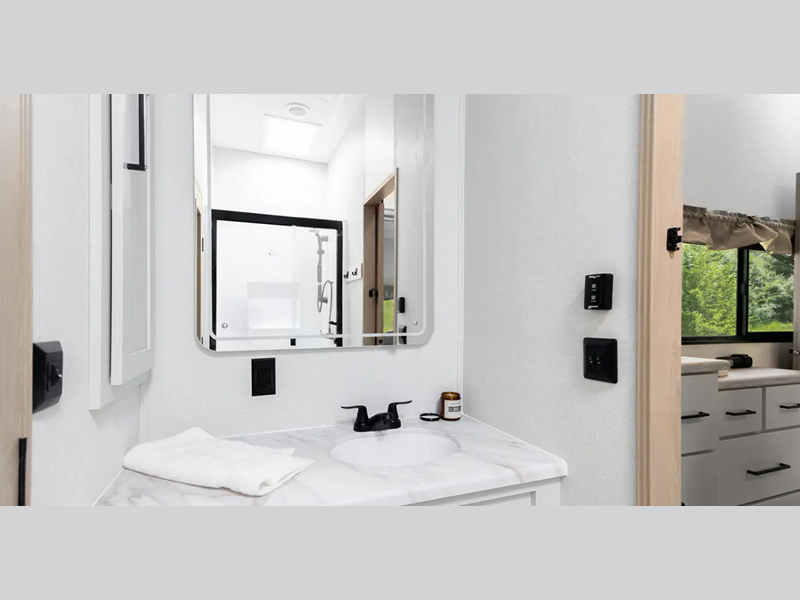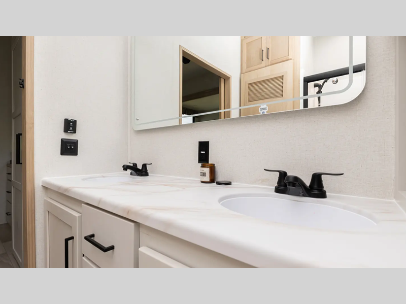 It will be so easy to enjoy extended stays with a spacious shower, solid surface countertops, a stainless steel kitchen package, plus washer and dryer prep! A tankless water heater will provide convenience each day, and the dual ducted 15k BTU A/C units will help keep you comfortable. You'll find many hassle-free features outside as well, such as an electric awning with an LED light strip, a folding grab handle, two 30 lb. LP tanks, and more!